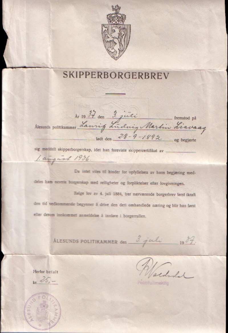 Skipperborgerbrev - 1937, 3 juli fremstod på Ålesunds politikammer Lauritz Ludvig Martin Liavaags født den 28-9-1892 og begjærte sig meddelt skipperborgerskap, idet han foreviste skippercertifikat av 1. august 1936.